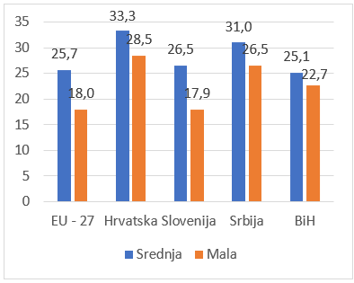 Posmatrajući % preduzeća sa e-trgovinom od najmanje 1% vlastitog prometa u 2022. godini, možemo zaključiti da BiH ima procenat srednjih preduzeća na nivou prosjeka EU, dok malih preduzeća sa e-trgovinom od najmanje 1% vlastitog prometa ima iznad nivoa prosjeka EU.