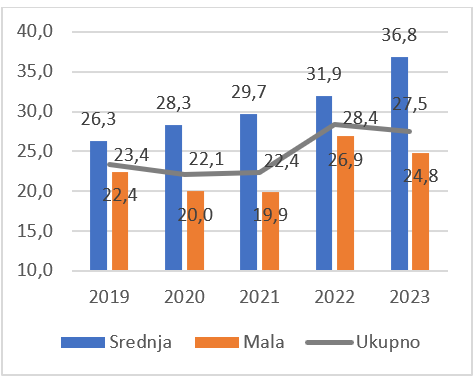 Obim e-trgovine u odnosu na konvencionalnu trgovinu još uvijek je prilično nizak. Samo 27,5% od ukupnog broja preduzeća koristi web poslovanje, odnosno e-trgovinu. U 2023. putem web-a trgovalo je 24,8% malih preduzeća i 36,8% srednjih preduzeća. U 2023. godini, u odnosu na 2022, zabilježen je pad ukupne e-trgovine u iznosu od 0,9 procentnih poena. Kod velikih preduzeća pad je bio 5,9 procentnih poena, srednja su rasla 4,9 procentna poena, dok su mala pala za 2,1 procentna poena.