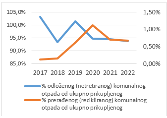 Udio netretiranog otpada (lijeva skala) i recikliranog otpada (desna skala)