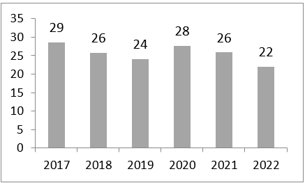 Udio javnog duga u odnosu na BDP u izvještajnoj godini iznosi 22%, što predstavlja pad u odnosu na prethodnu godinu kada je udio javnog duga iznosio 26% BDP-a. U periodu od 2017-2022. godine zabilježen je pad udjela duga u BDP-u, izuzev 2020. godine.
