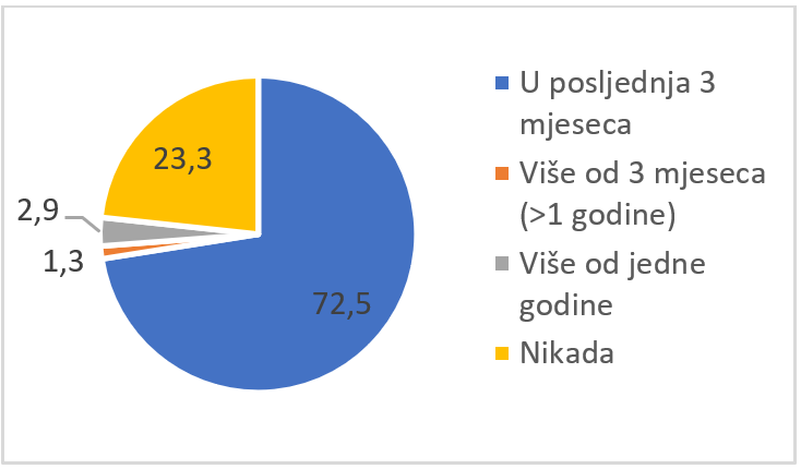U FBiH 72,5% pojedinaca u domaćinstvu je koristilo internet u referentnom kvartalu 2021. godine, 1,3% pojedinaca je koristilo internet prije više od 3 mjeseca, 2,9% pojedinaca je koristilo internet prije više od jedne godine.