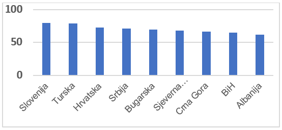 Prethodni grafikon prikazuje indeks univerzalne zdravstvene pokrivenosti koji za BiH iznosi 65 u 2019. godini, te je među najnižim u svijetu.
