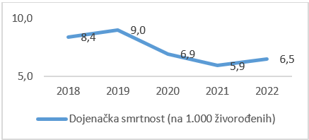 akon što je u periodu 2019–2021. godina zabilježen pad stope dojenačke smrtnosti (na hiljadu stanovnika), u 2022. godini broj umrle djece do 1 godine (dojenčadi) porastao je za 9,1%, u odnosu na prethodnu godinu.