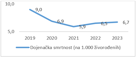 Nakon što je u periodu 2019–2021. godina zabilježen pad stope dojenačke smrtnosti (na hiljadu stanovnika), u 2022. i 2023. godini broj umrle djece do 1 godine (dojenčadi) je porastao.