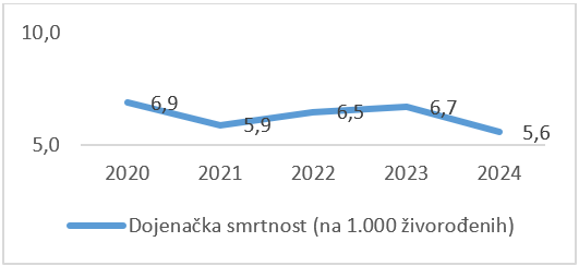 Nakon što je u periodu 2021-2023. godine zabilježen rast stope dojenačke smrtnosti (na hiljadu živorođenih), u 2024. godini broj umrle djece do 1 godine (dojenčadi) je opao.
