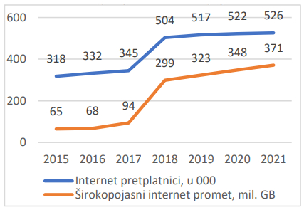 Posmatrajući period 2016–2020. godina, vidi se trend značajnog rasta širokopojasnog internet prometa. U 2021. godini, u odnosu na 2020. godinu, internet promet je bio veći za 6,6%.