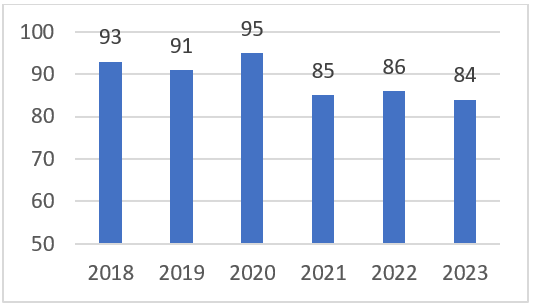 U 2023. godini, BiH je zauzela 84. mjesto od ukupno 218 zemalja prema udjelu izvoza visoko-tehnoloških proizvoda u ukupnom izvozu prerađivačke industrije (5%). U odnosu na početnu vrijednost iz 2018. godine, BiH je na rang listi napredovala za 9 mjesta.