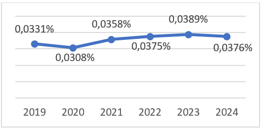 Izvoz BiH u 2024. godini (16,0 mld.KM) manji je u odnosu na 2023. godinu (16,7 mld.KM), pa je tako i udio izvoza BiH u ukupnom svjetskom izvozu smanjen na 0,0376%.