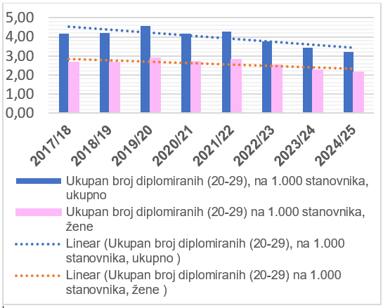 Broj diplomiranih studenata (dob 20-29) na 1.000 stanovnika u FBiH (2017/18-2024/25)