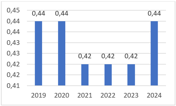Prema faktoru 2 Indeksa vladavine prava – Odsustvo korupcije, vrijednost indeksa se povećala u odnosu na prethodne godine. Globalni prosjek za 2024. godinu iznosi 0.51. Indeks za BiH je ispod globalnog prosjeka.