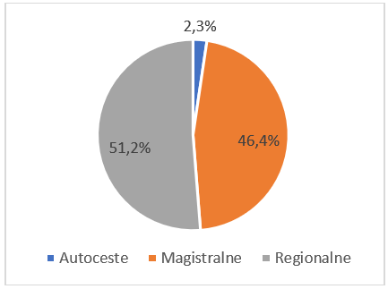 Od ukupno 5,085 km cesta na autoceste se odnosi 2,3%, na magistralne ceste se odnosi 46,4%, dok se na regionalne ceste odnosi 51,2%.