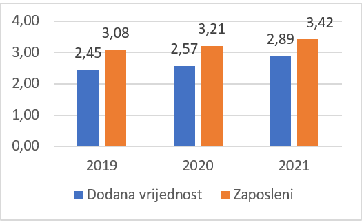 Veliki rast od 27% je zabilježen u 2021. godini u odnosu na 2020. godinu. Bruto dodana vrijednost u KKI u 2021. godini je bila 727 mil. KM, a prethodne godine je bila 573 mil. KM. Posmatrajući relativno učešće bruto dodane vrijednosti KKI u bruto domaćem proizvodu (BDP) u tržišnim cijenama, u FBiH ukupno, vidimo da je došlo do porasta od 0,31 procentnih poena u 2021. godinu u odnosu na prethodnu godinu.