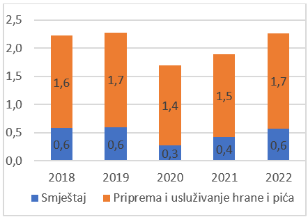 Procenat bruto dodane vrijednosti područja djelatnosti I - Djelatnosti pružanja smještaja, te pripreme i usluživanja hrane (hotelijerstvo i ugostiteljstvo) u BDP-u je u 2022. godini prastao za 0,4 procentna poena, u odnosu na 2021. godinu.