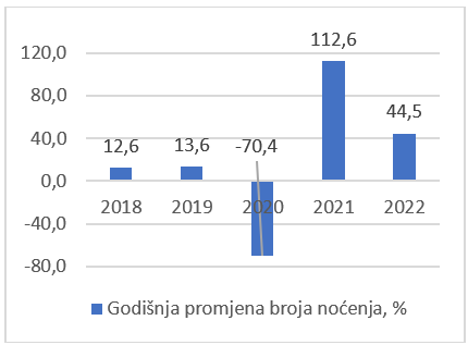 Procenat godišnje promjene broja noćenja u 2022. godini, u odnosu na 2021. godinu, rastao je 44,5%.