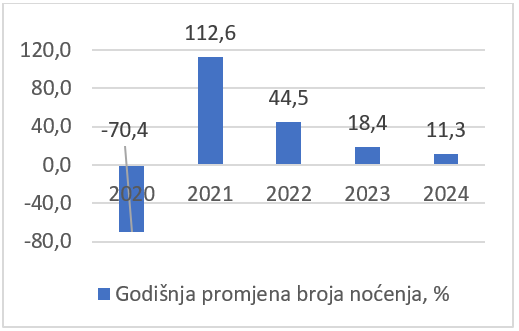 Procenat godišnje promjene broja noćenja u 2024. godini, u odnosu na 2023. godinu, rastao je 11,3%.