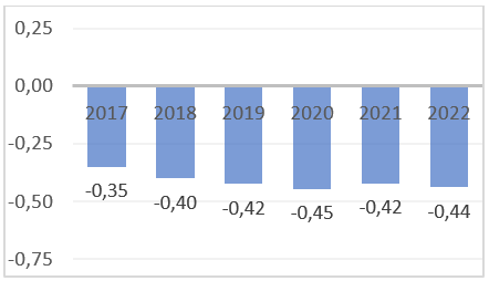 U 2022. godini, indeks percepcije vjerovatnoće političke nestabilnosti i/ili politički motiviranog nasilja, uključujući terorizam, se pogoršao. U periodu od 2017. do 2022., indeks bilježi negativan trend.